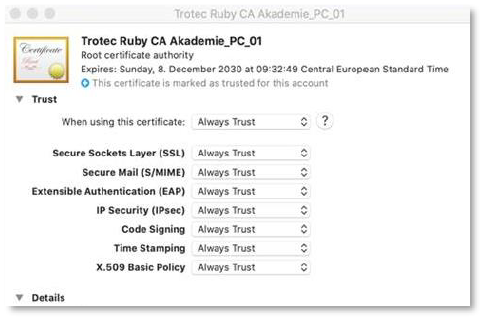To activate the certificate on a Mac please double click on it, enter the trust section and under “When using this certificate” select “Always Trust” for all entries.