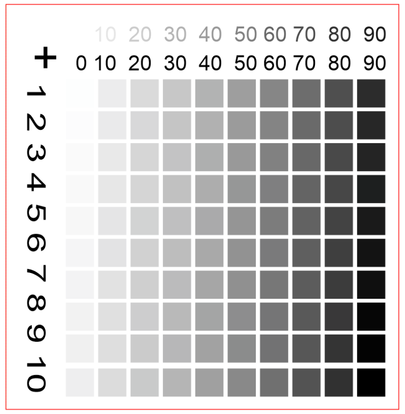 The test matrix consists of 100 different shades of gray. Using the Relief function in Ruby® or in the JobControl® printer driver, the appropriate parameters can easily be determined.